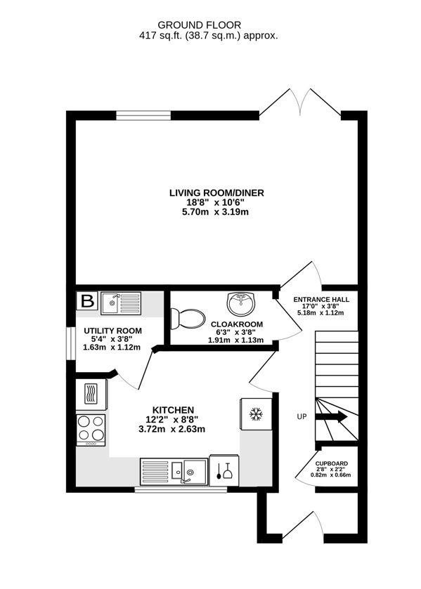 Composite front door to entrance hall. Storage cupboard containing consumer unit and space under the stairs. Doors leading to kitchen, living room/diner, cloakroom and stairs rising to the first floor. Two radiators.
