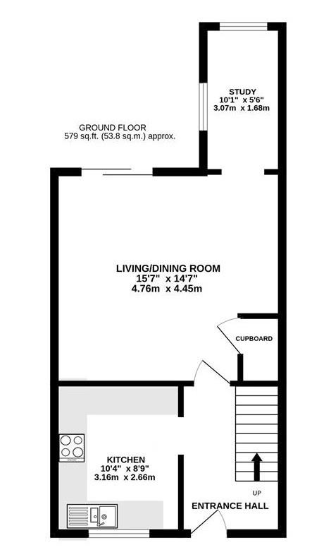 Radiator, built-in cupboard, access to study, inset gas fire with surround, patio doors to rear garden.