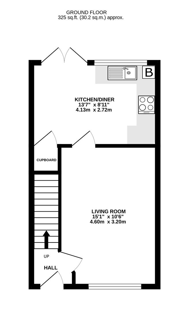 Double-glazed window and French doors to the garden, a range of wall and base units with work surface over, inset one-bowl sink with a drainer unit, and an integrated oven and hob with extractor hood over. Space and plumbing for washing machine. Further space for freestanding fridge freezer. Understairs storage cupboard.