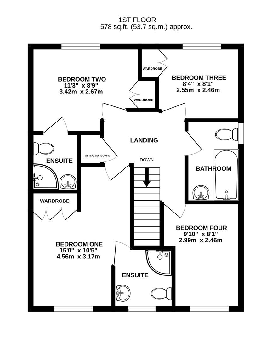 Grants access to all bedrooms and the bathroom, storage cupboard.